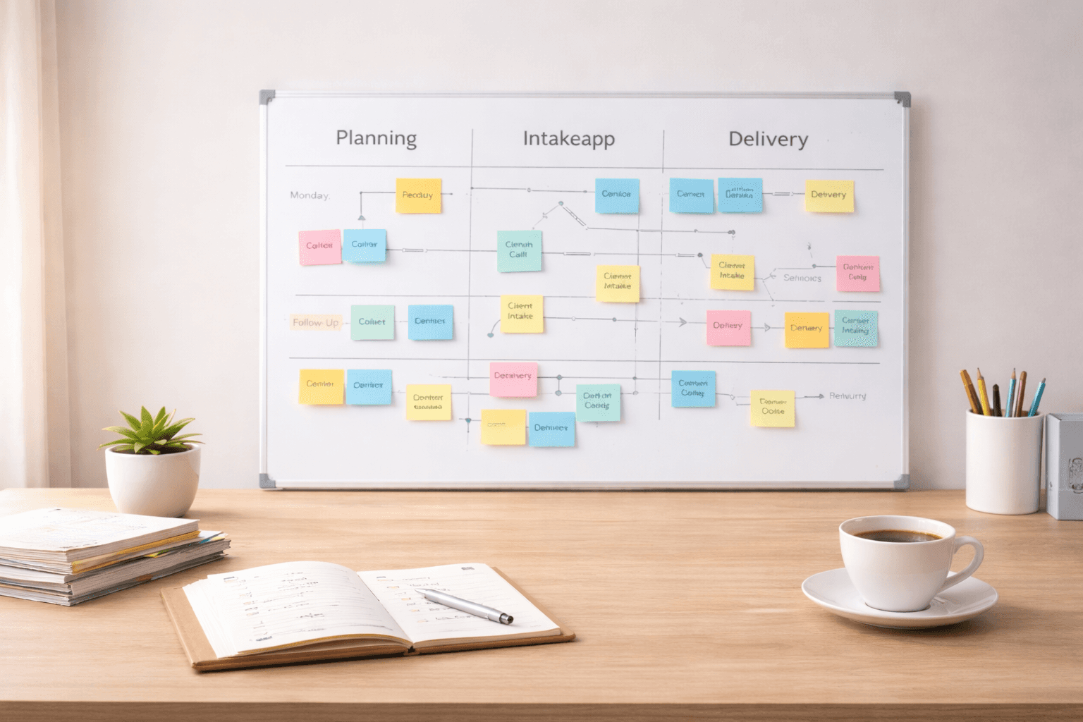 We brengen jouw intakeproces en klantstromen duidelijk in kaart en vertalen dit naar een logisch en overzichtelijk systeem.